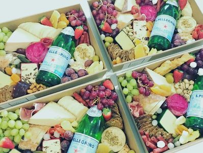 Gift box includes: Bottle of sparkling water, cured deli meats, variety of hand-picked cheeses, freshly made dips, assorted pickles, olives, nuts, dry and fresh seasonal fruit, bread and selection of crackers.