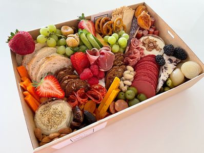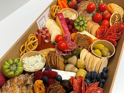 Grazing box includes: Selection of cured deli meats, variety of hand-picked cheeses, freshly made dips, assorted pickles, olives, nuts, dry and fresh seasonal fruit, bread and selection of crackers.